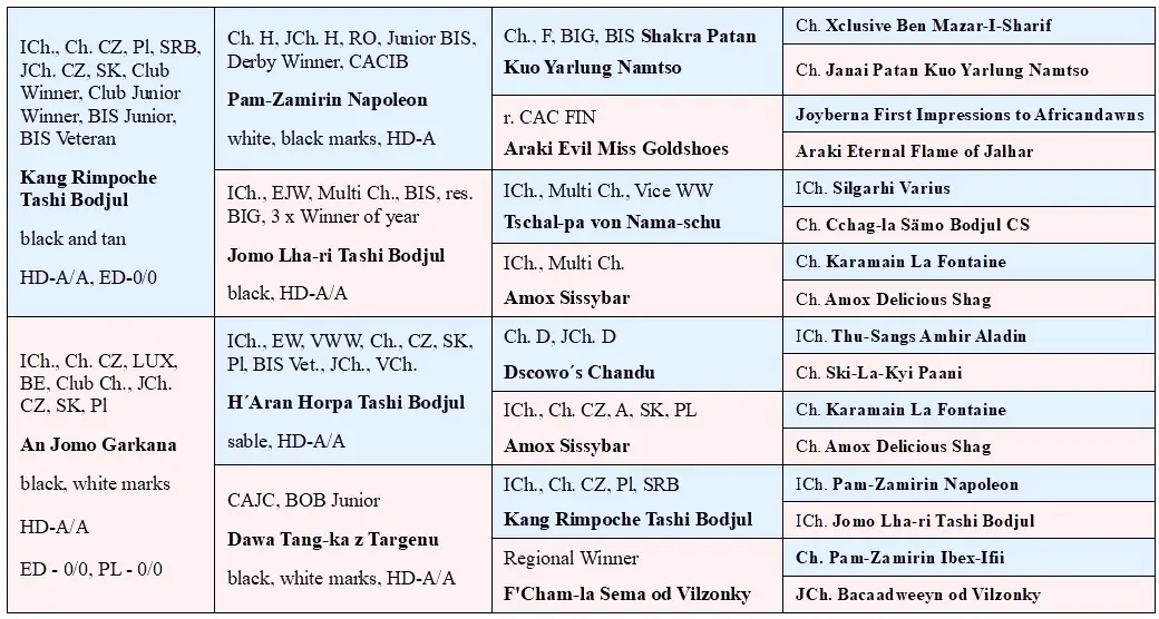 International champion (C.I.B.), Czech, Polish, Slovakian, Slovenian, Bosnian and Herzegovinian, Austrian & German VDH Champion, Czech Junior Champion, Club Champion TTC CZ, Champion CMKU, Czech, Austrian & Bosnian and Herzegovinian Grand Champion, Champion Federation Bosnia and Herzegovina